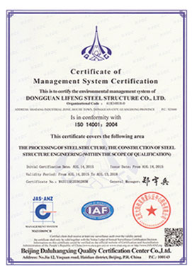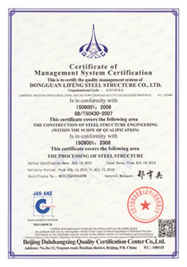 Professional design and construction team provide customers with better service ; advanced management concepts , professional skills are the basis of our cooperation . Lifeng obtains international quality management system ISO9001: 2008, ISO14001 environmental management system and ISO18001 environment system certification and health , Singapore S1 issued by SSSS .Our company owns Lloyds certified welder qualification and U.S. AWS certification.